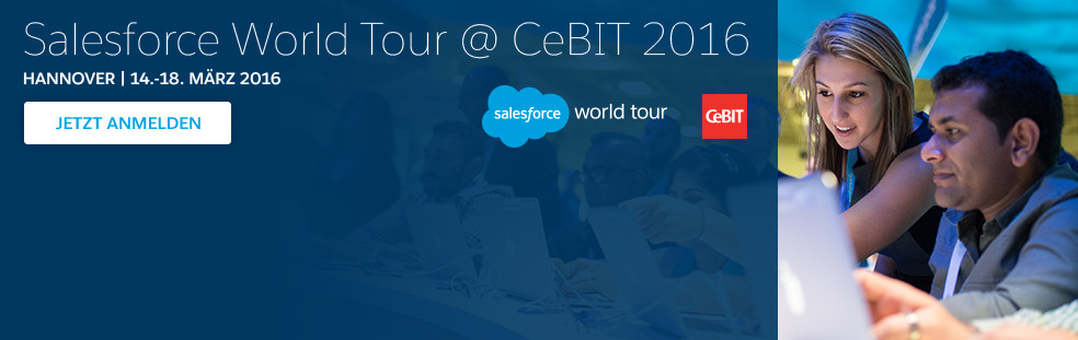Wir laden Sie herzlich zur Salesforce World Tour @ CeBIT 2016 in Halle 23 ein und freuen uns Sie vor Ort zu treffen.