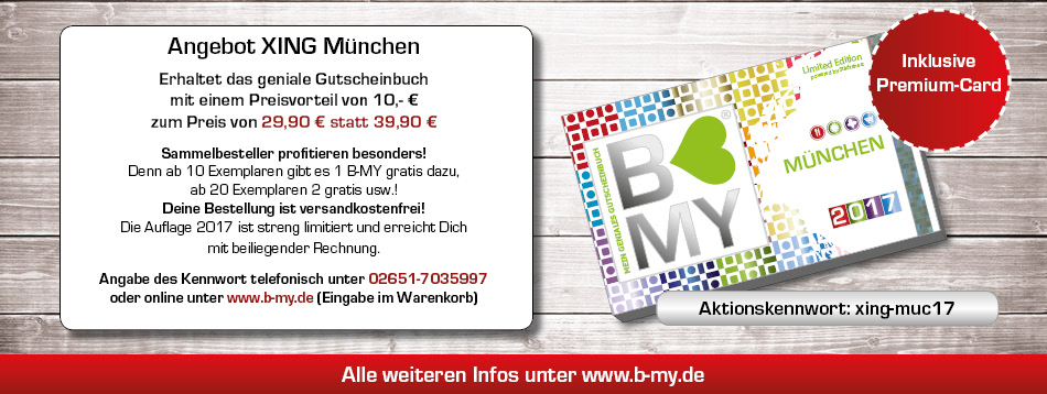 Mit der neuen Ausgabe entdeckst Du neue und altbekannte Teilnehmer, erlebst deren Leistung und sparst kräftig dabei. B-MY München ist kein gewöhnliches Gutscheinbuch – es ist Dein Begleiter zu den Top-Adressen aus Gastronomie, Freizeit, Wellness und Einkaufen!